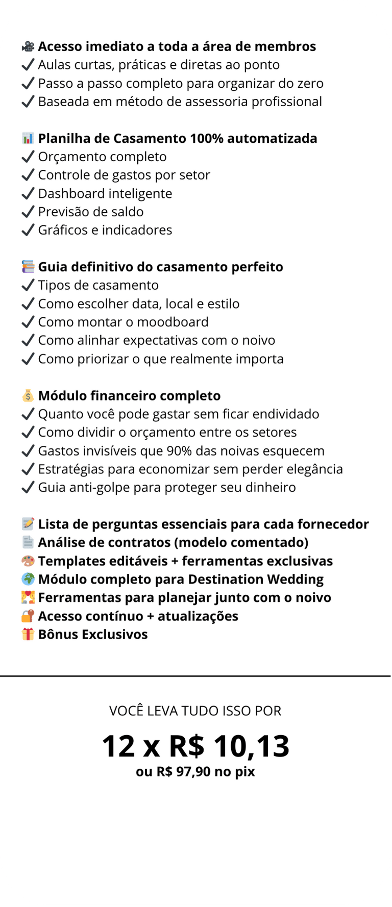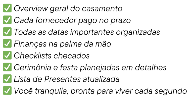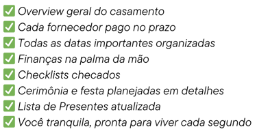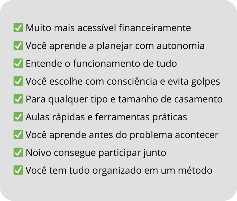 Todo o método deste programa deriva de protocolos profissionais usados em casamentos, agora adaptados para que qualquer noiva tenha acesso ao mesmo nível de organização e segurança que antes só era possível com assessoria de alto padrão